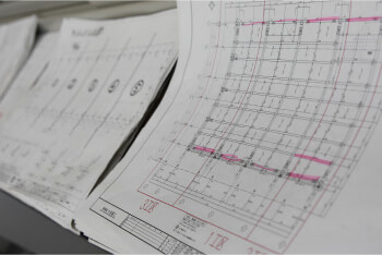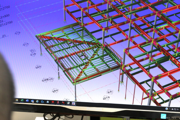 建築を請け負うお客様から建物全体の設計図をいただき、そこから鉄骨部分だけを読み取り、加工に必要な鉄骨部材の数やサイズなどを鉄骨専用CADシステムにより割り出します。